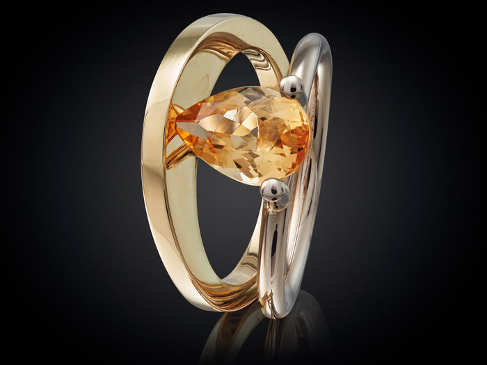 Deze collectie heet niet voor niets de Danser. De wit- en roodgouden zettingen van deze opvallende 18 karaat roodgouden ring met lichtblauwe sky topaas en roze morganiet hangen flexibel aan de ring, waardoor ze bij iedere beweging lijken te dansen. En ritmisch muziek maken zodra jij je hand heen en weer beweegt.
