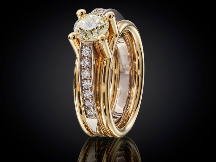 Deze exclusieve ring is opgebouwd uit 18 karaat wit- en geelgoud. De brede middenband geeft ruimte voor een prachtige rij van 14 incrustatie gezette 0.02 crt diamant. Door de witte diamant in het witgoud, komt de 1.01 crt natural yellow diamant in het midden nóg mooier uit.